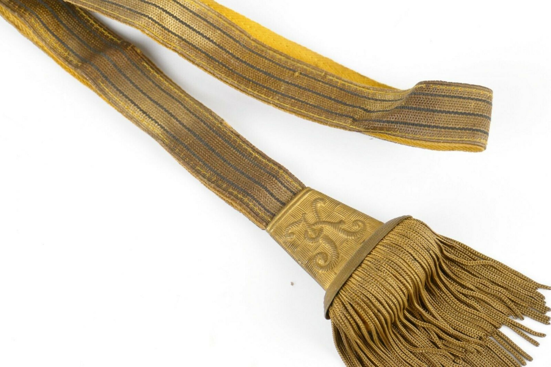 Die Feldbinde, aus kaisergelber und schwarzer Seide, ist aus dem Band und Quasten zusammengesetzt. Das Band ist mit schwarzen, gelb durchbrochenen Streifen verziert. Die Quaste besteht aus einem flachen Knopf, auf dessen Seiten der Namenszug Allerhöchst Seiner Majestät und der Adler gestickt sind und an dessen unterem Rand mehrere Lagen Fransen frei herabhängen; letztere, deren äußere Lage gelb, die innere schwarz und abgebunden ist, sind 24 cm lang.